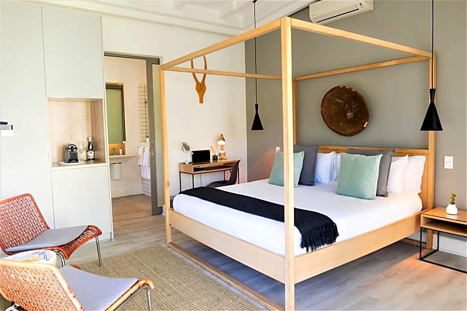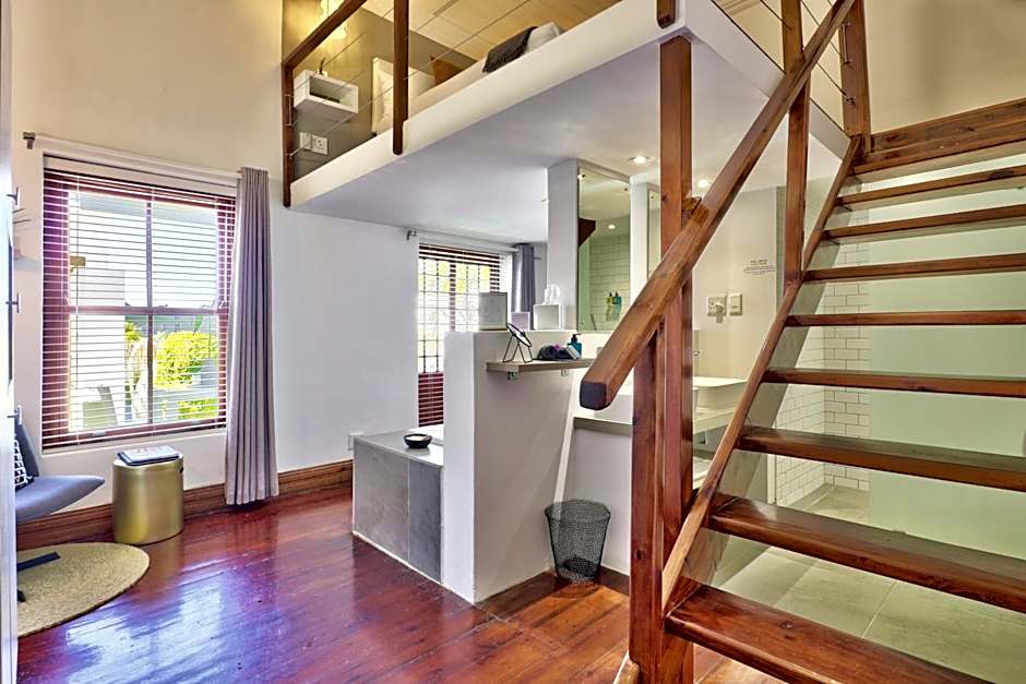 This room features an open-plan bathroom on the ground floor, and a Queen-size bed on the mezzanine level. The ceiling height on the elevated level is 5.6 feet high.